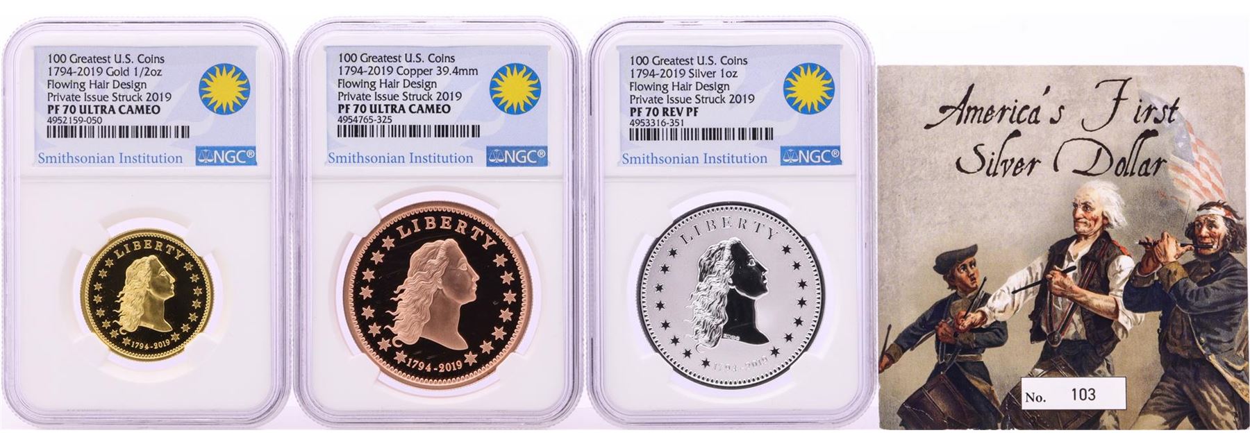 One 1794-2019 Smithsonian America's Finest Silver Dollar 3 Medal Set NGC PF70 Ultra Cameo. NGC Certified.
