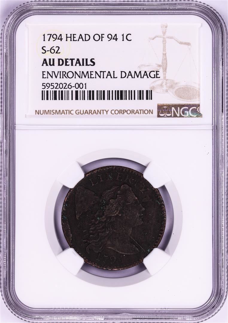 One 1794 Head of 94 S-62 Flowing Hair Large Cent Coin NGC AU Details. NGC Certified.