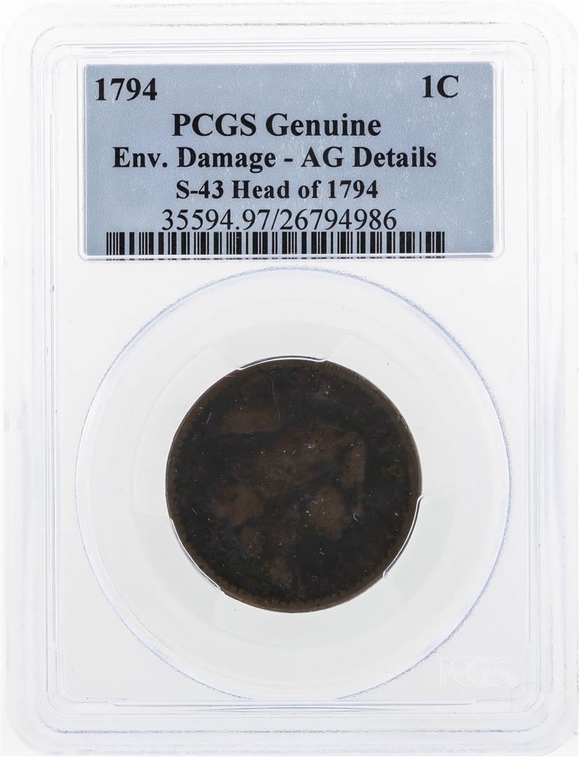One 1794 Liberty Cap Cent S-43 Head of 1794 Coin PCGS Genuine Env. Damage -AG Details. PCGS Graded.