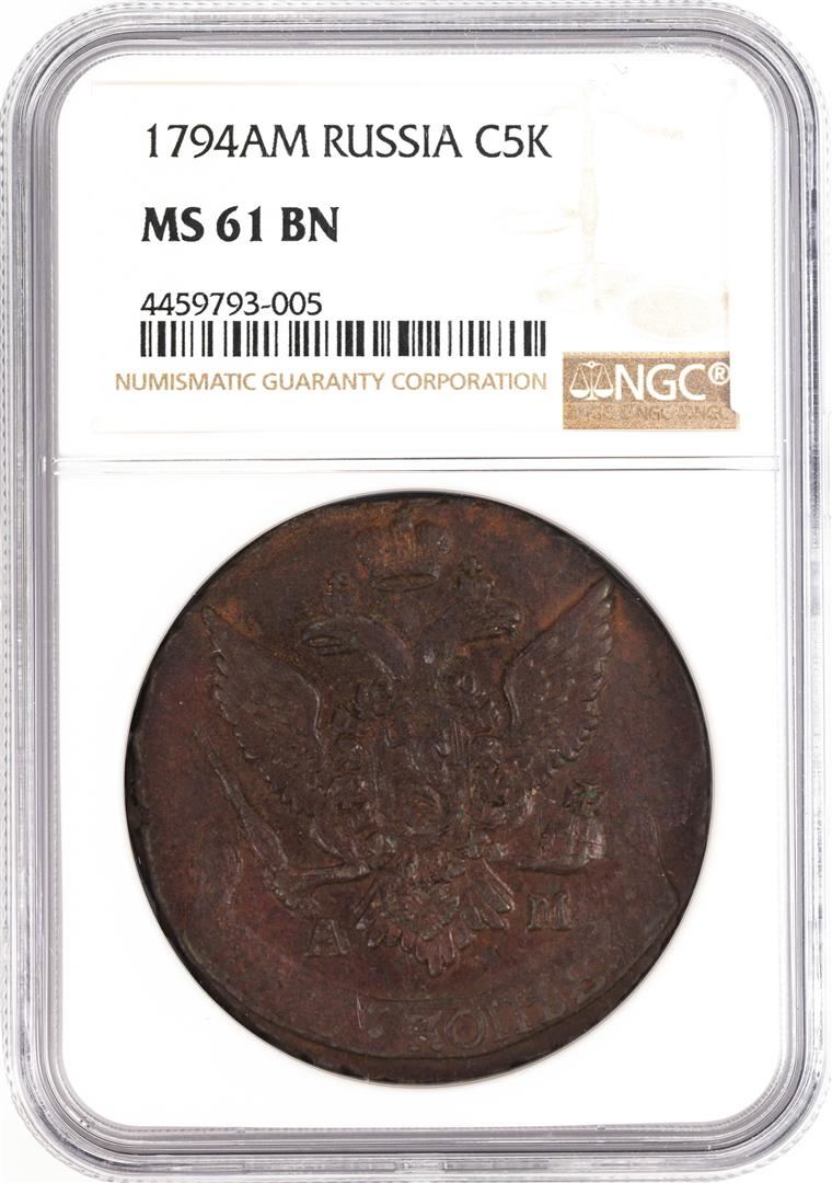 One 1794AM Russia 5 Kopek Coin NGC MS61BN. NGC Certified.