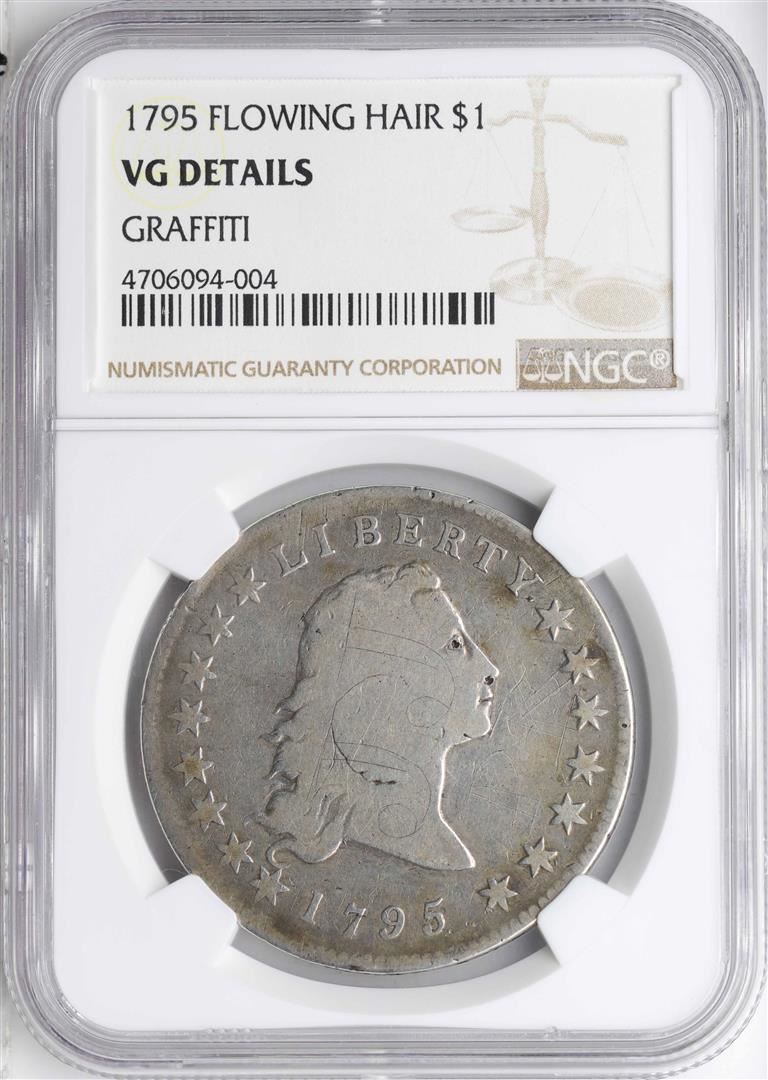 One 1795 $1 Flowing Hair Silver Dollar Coin NGC VG Details Graffiti. NGC Certified.