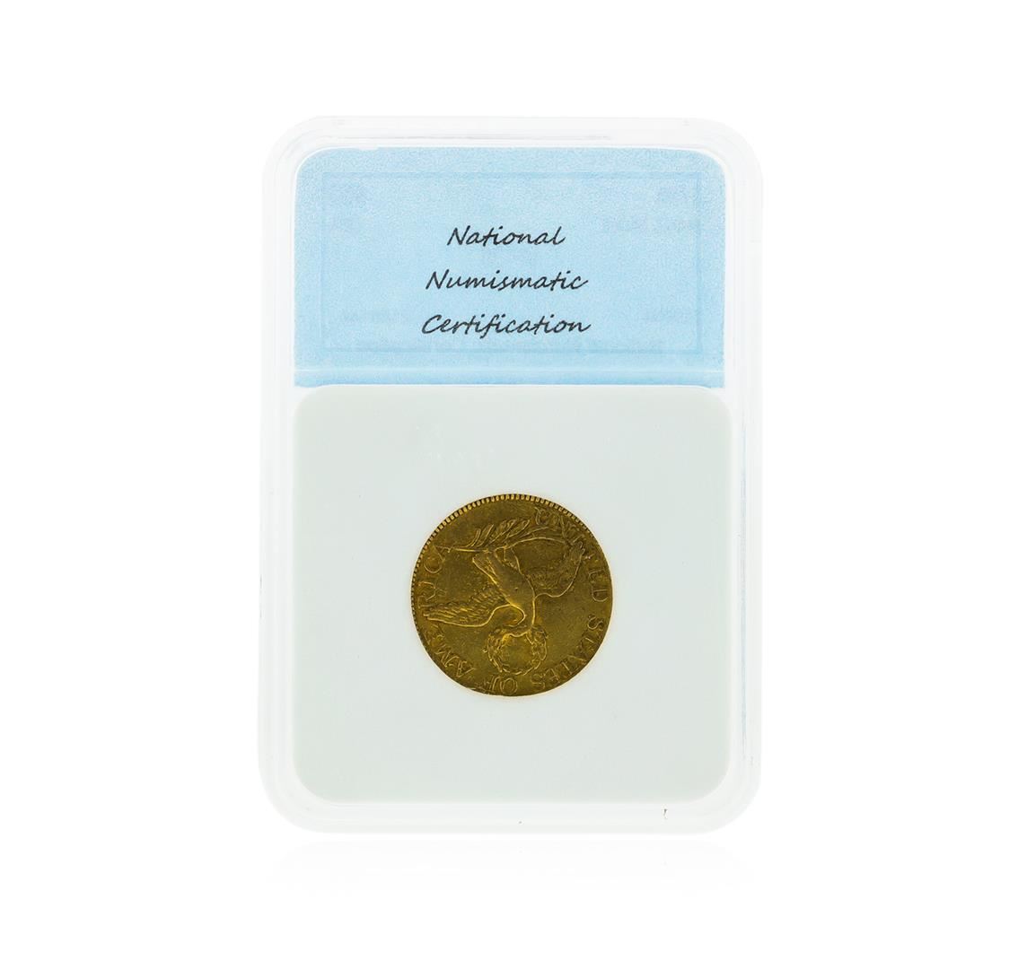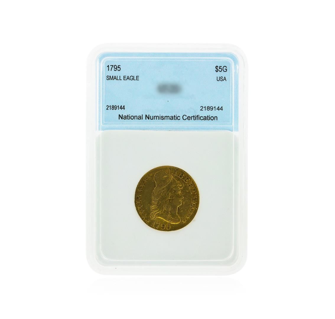 One 1795 $5 Small Eagle Capped Bust Gold Coin. This coin has been graded by "National Numismatic Certification" company. However, since it is not one of the main numismatic certification companies that we currently recognize, we purposely blurred out the assigned grade of the coin to avoid any confusion. We encourage each bidder to make their own determination as to the grade & value of the coin.