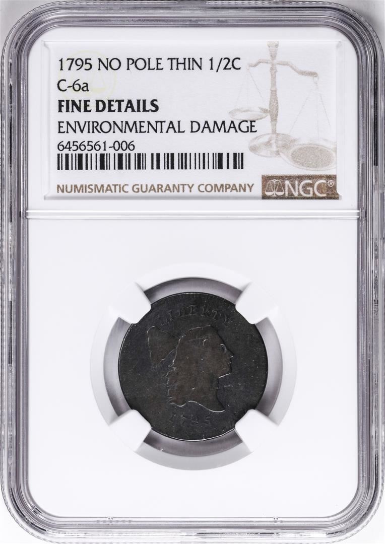 One 1795 No Pole Thin C-6a Liberty Cap Half Cent Coin NGC Fine Details. NGC Certified.
