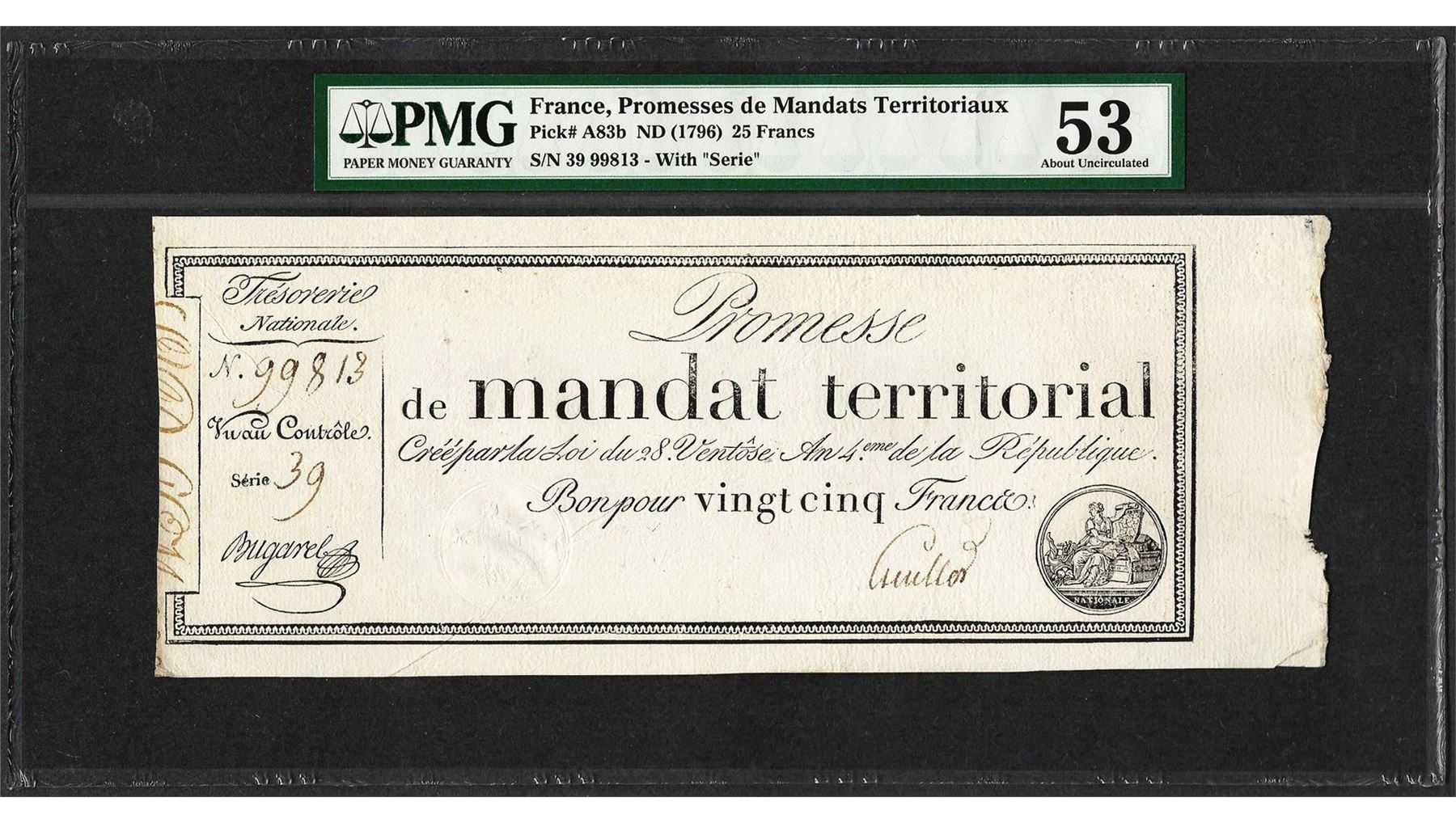One 1796 France Promesses de Mandats Territoriaux 25 Francs PMG About Uncirculated 53. PMG Certified.