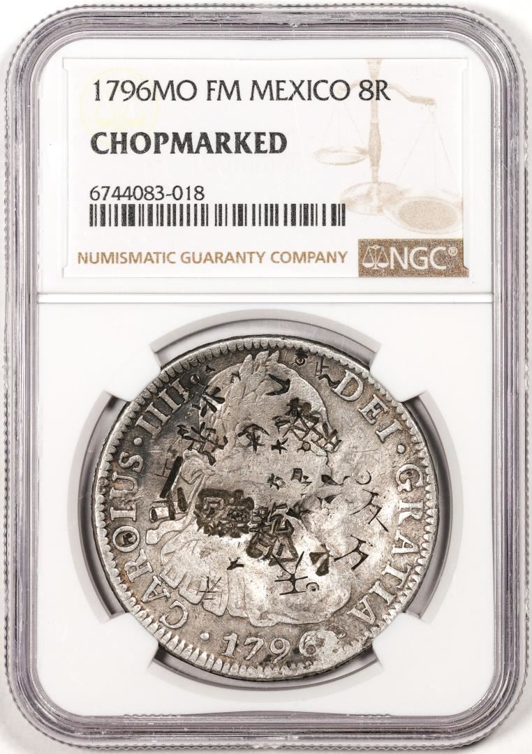 One 1796MO FM Mexico 8 Reales Silver Coin NGC Chopmarked. NGC Certified.
