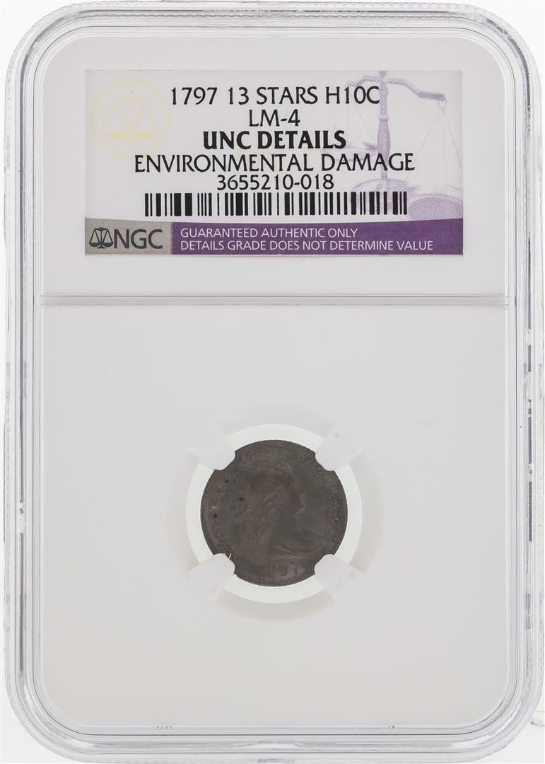 One 1797 13 Stars Draped Bust Half Dime Coin NGC Environmental Damage. 13 stars all half dimes of this 2 year type are scarce. Usually found AG to very good. This is the rarer 13 stars. PCGS has only graded 1 uncirculated example. PCGS price guide for a MS-60 is $60,000. This example is uncirculated, shows no sign of wear, however age, time, and climate have lightly environmentally show signs on this coin. NGC Certified.