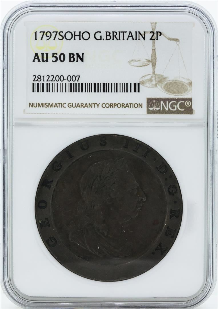 One 1797 SOHO Great Britain 2 Pence Coin NGC AU50BN. NGC Certified.