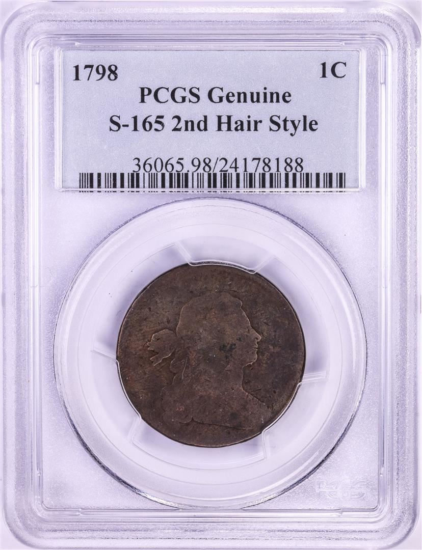 One 1798 Draped Bust Large Cent Coin PCGS Genuine S-165 2nd Hair Style. PCGS Graded.
