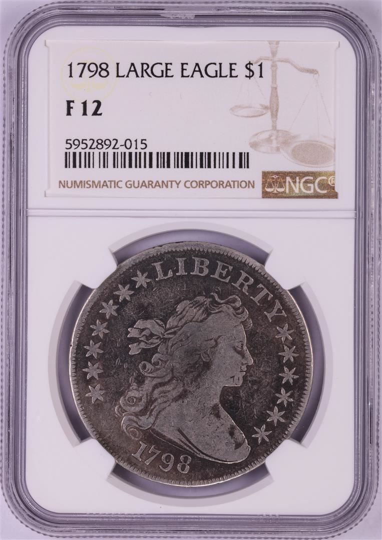 One 1798 Large Eagle $1 Flowing Hair Silver Dollar Coin NGC F12. NGC Certified.
