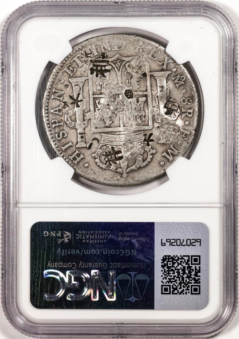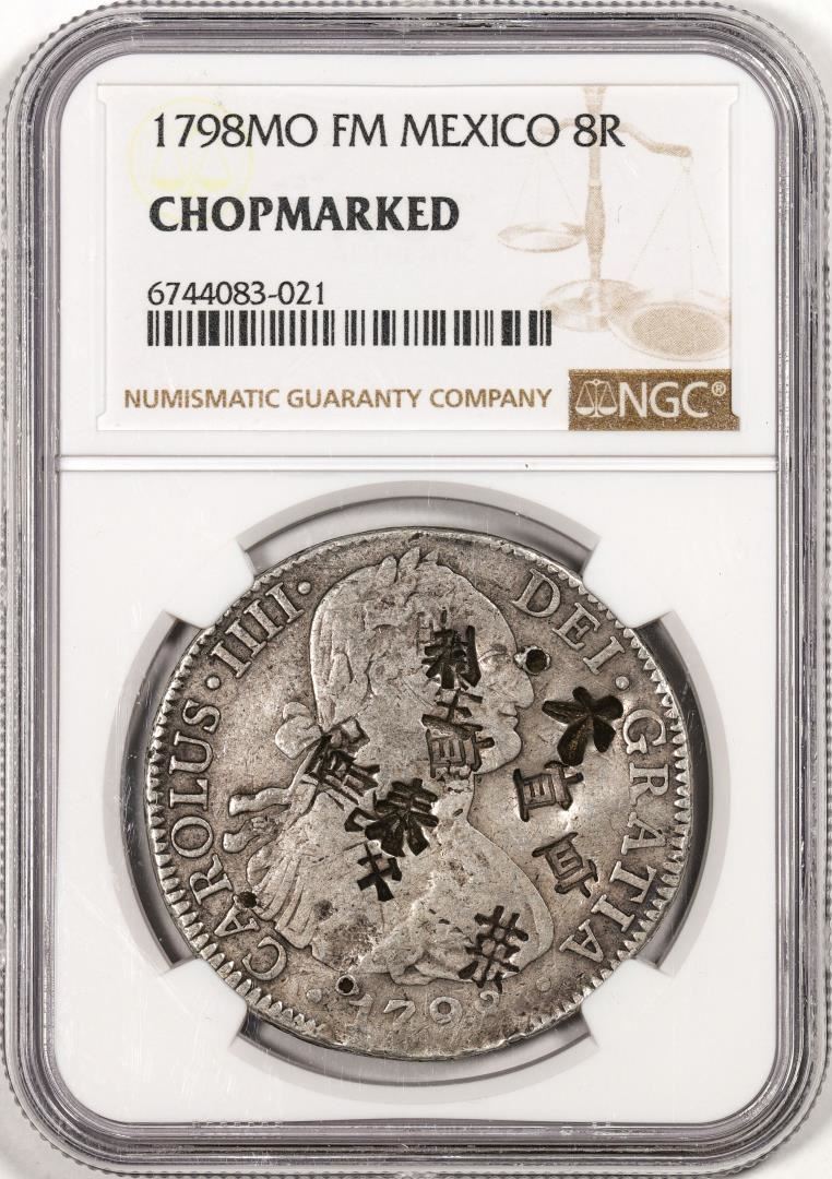 One 1798MO FM Mexico 8 Reales Silver Coin NGC Chopmarked. NGC Certified.