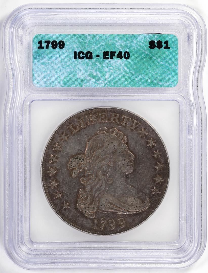 One 1799 $1 Draped Bust Silver Dollar Coin ICG EF40. ICG Certified.