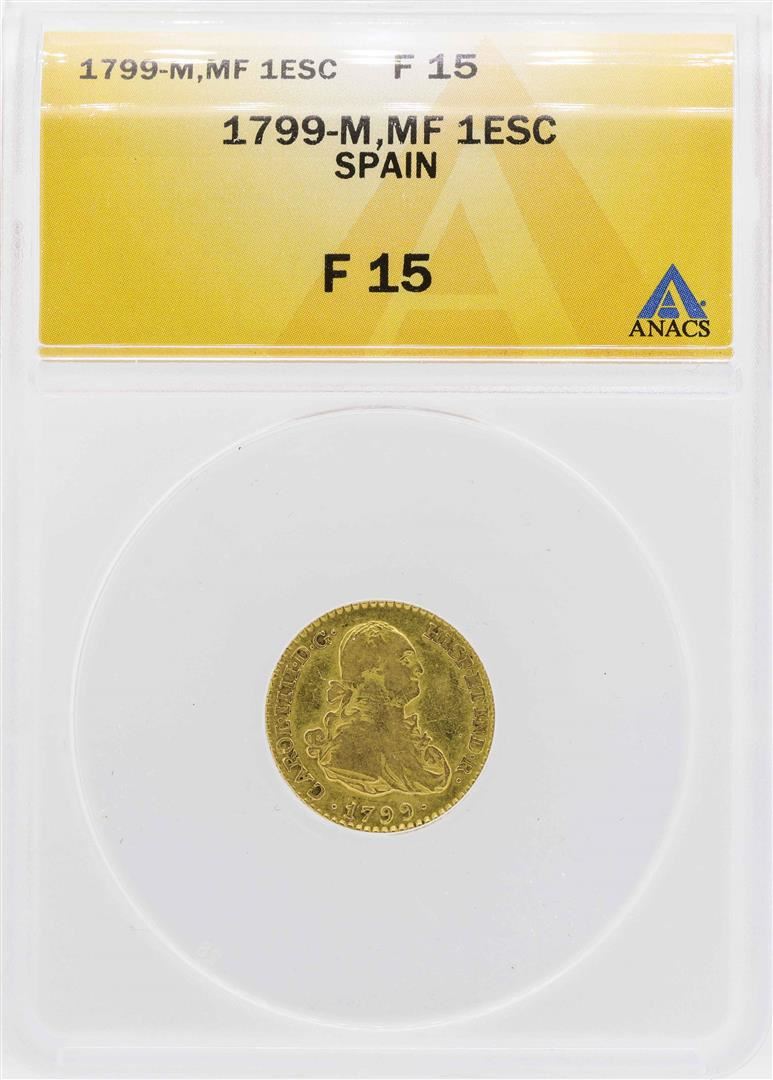 One 1799-M MF Spanish Escudo Gold Coin ANACS F15. ANACS Certified.