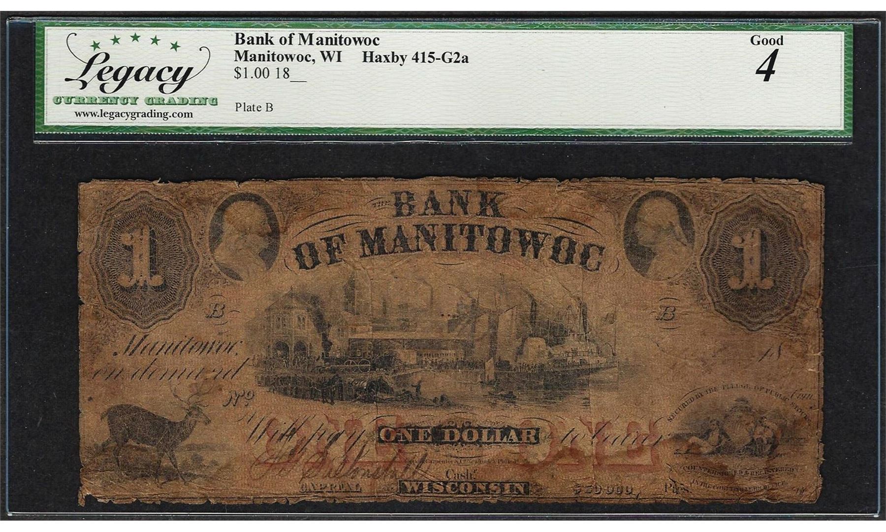 One 1800's $1 Bank of Manitowoc Wisconsin Obsolete Note Haxby 415-G2a Legacy Good 4. Legacy Graded.