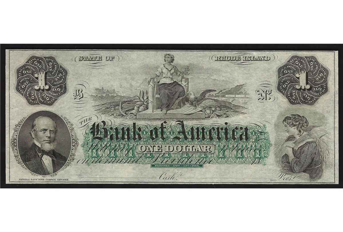 1800's $1 Rhode Island Bank of America Obsolete Bank Note