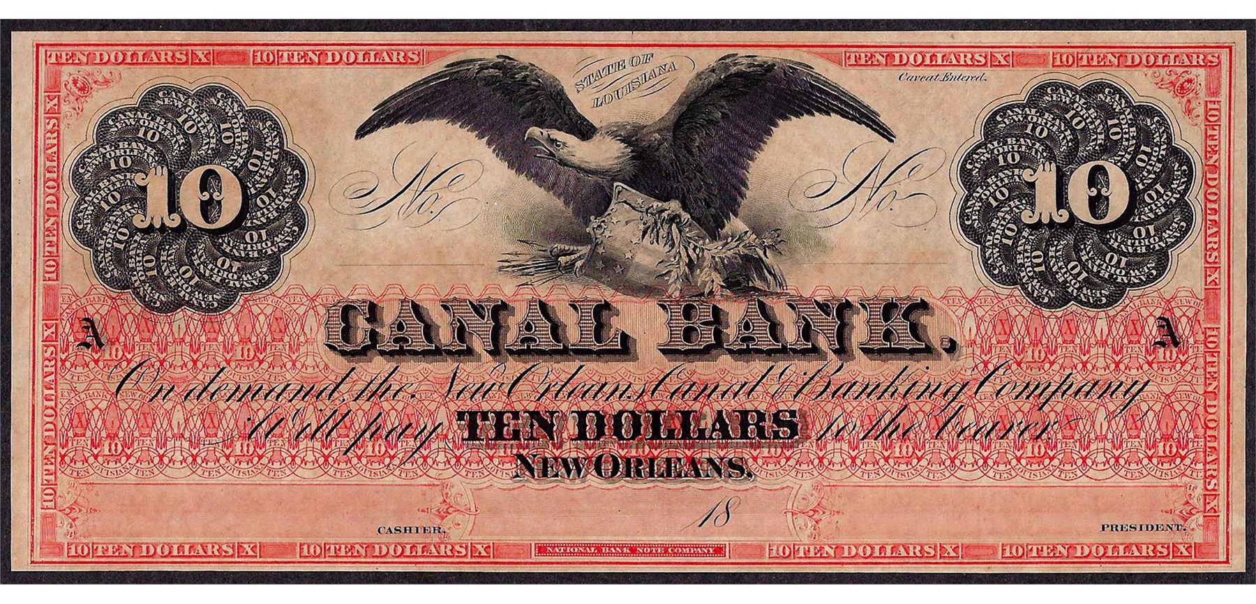 One 1800's $10 Canal Bank New Orleans Obsolete Bank Note.