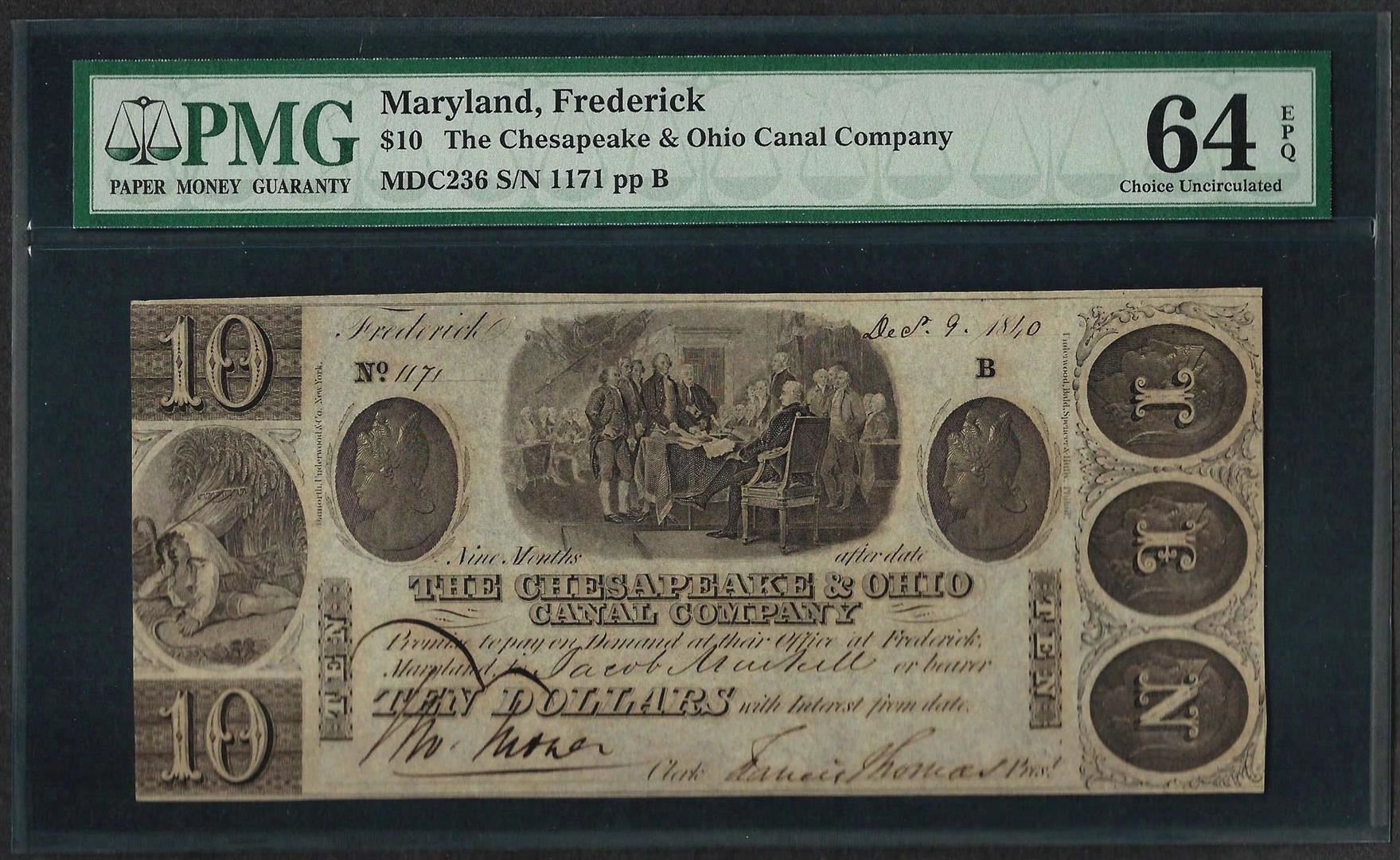 One 1800's $10 Chesapeake & Ohio Canal Company Obsolete Note PMG Choice Uncirculated 64EPQ. PMG Certified.