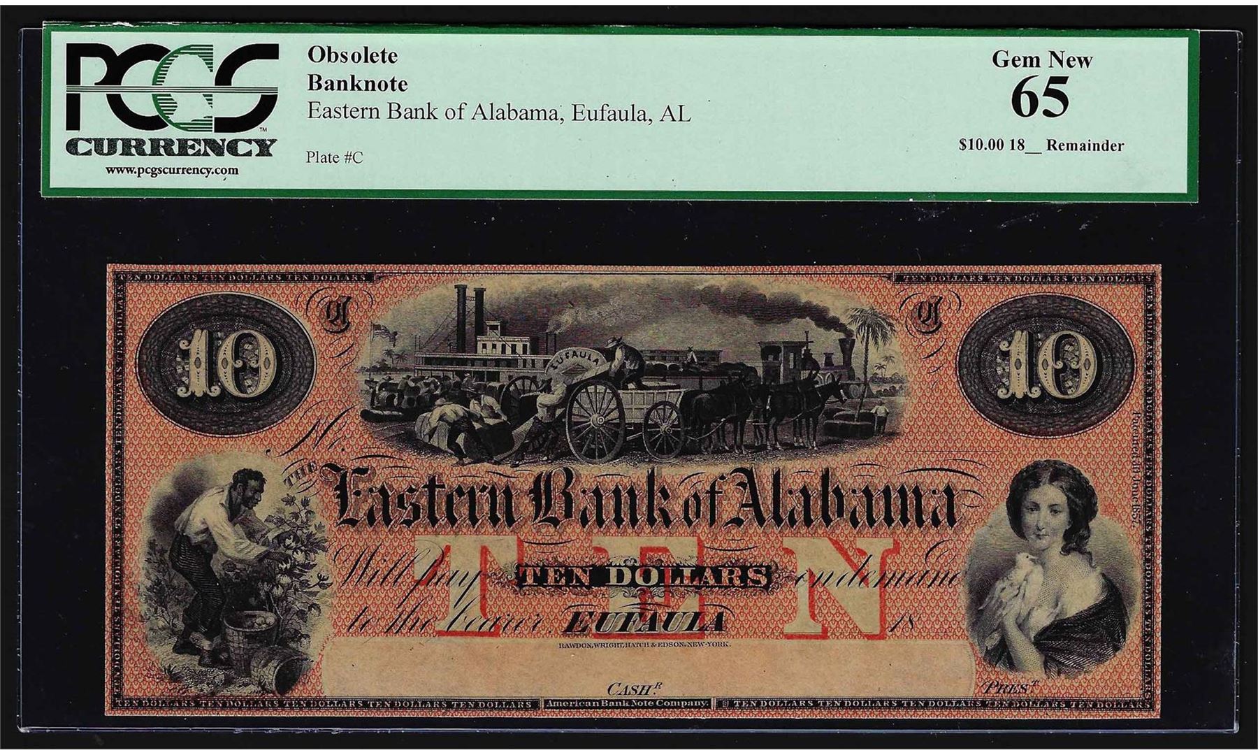One 1800's $10 Eastern Bank of Alabama Eufaula, AL Obsolete Bank Note PCGS Gem New 65. PCGS Graded.