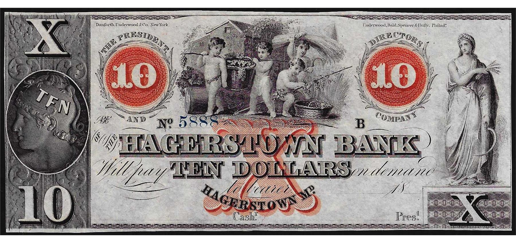 One 1800's $10 Hagerstown Bank Maryland Obsolete Bank Note.