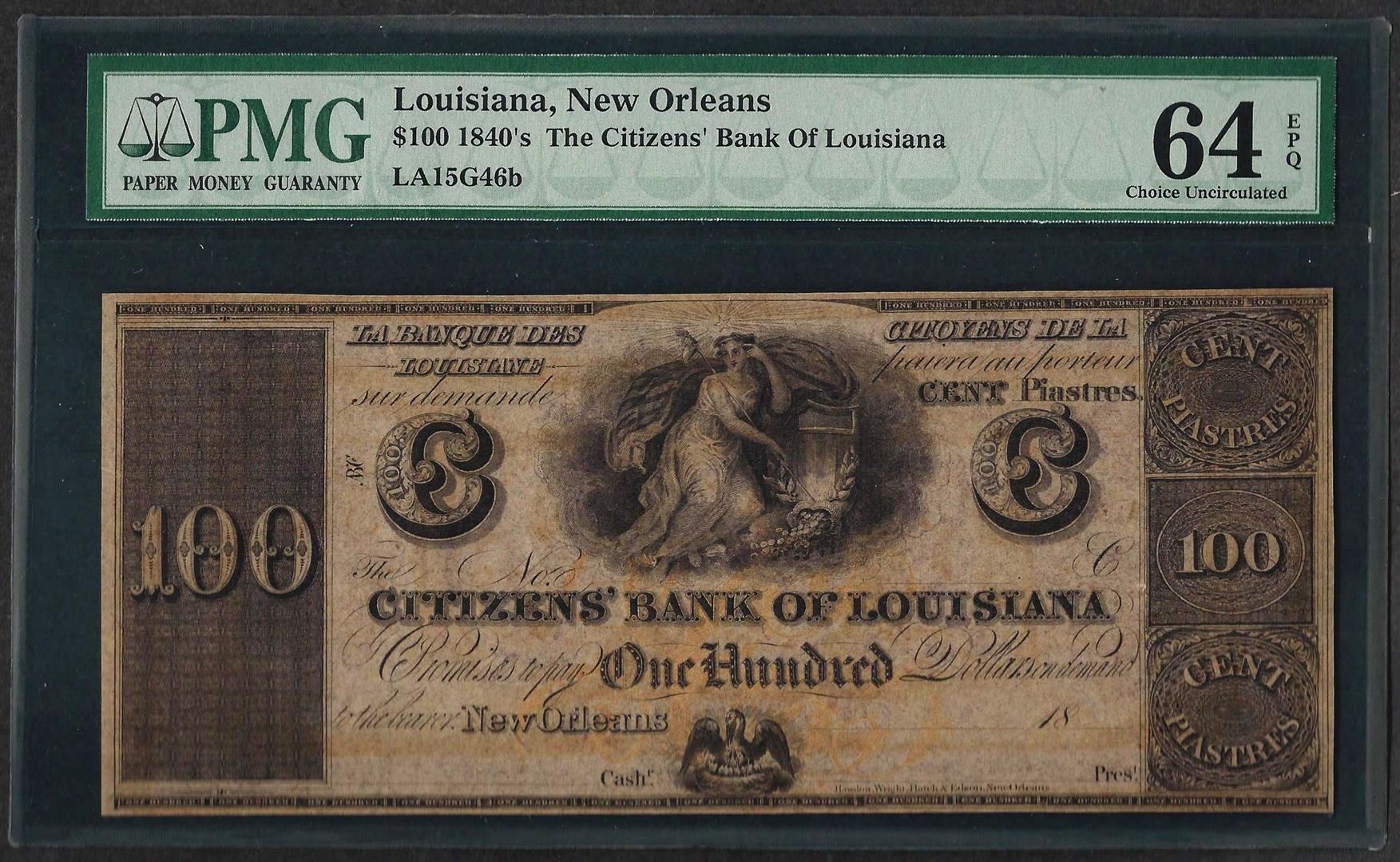 One 1800's $100 Citizens Bank of Louisiana Obsolete Note PMG Choice Uncirculated 64EPQ. PMG Certified.