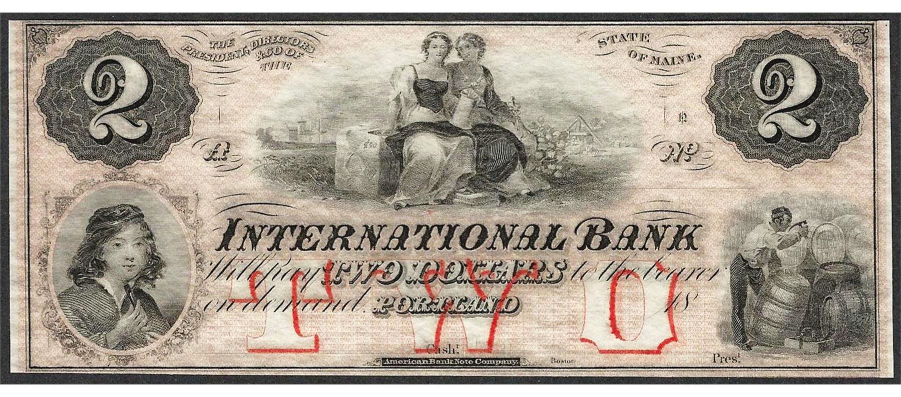 One 1800's $2 International Bank of Portland State of Maine Obsolete Note.