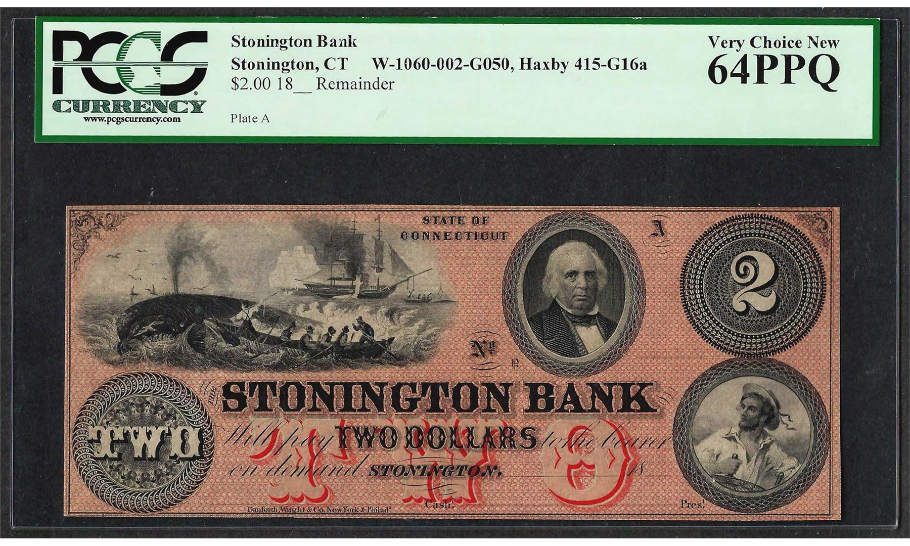 1800's $2 Stonington Bank Obsolete Currency Note PCGS Very Choice New 64PPQ