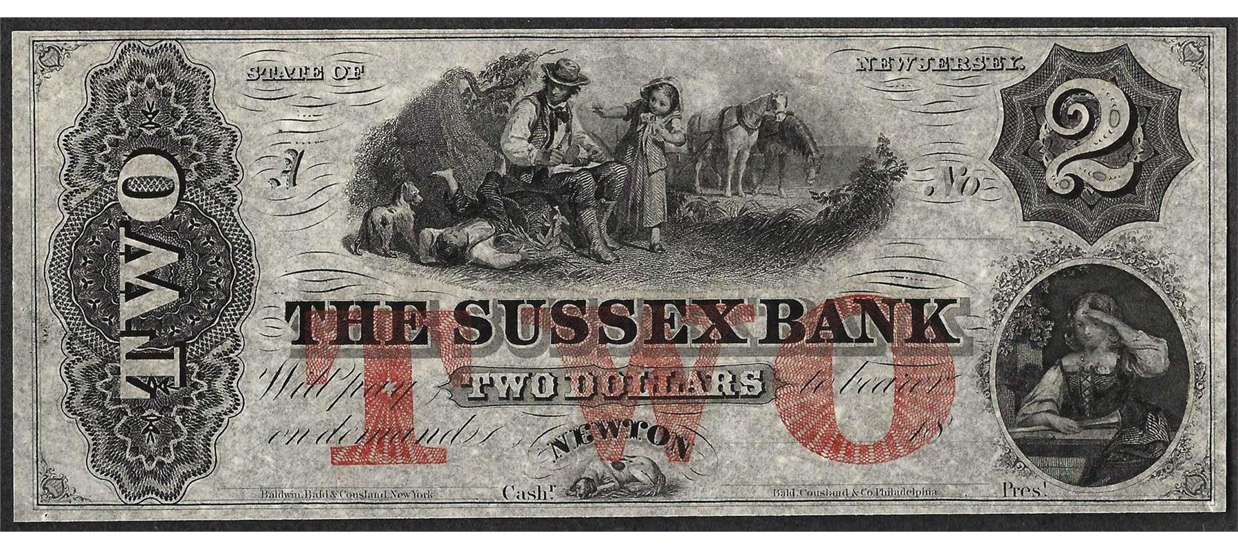 One 1800's $2 Sussex Bank New Jersey Obsolete Note.