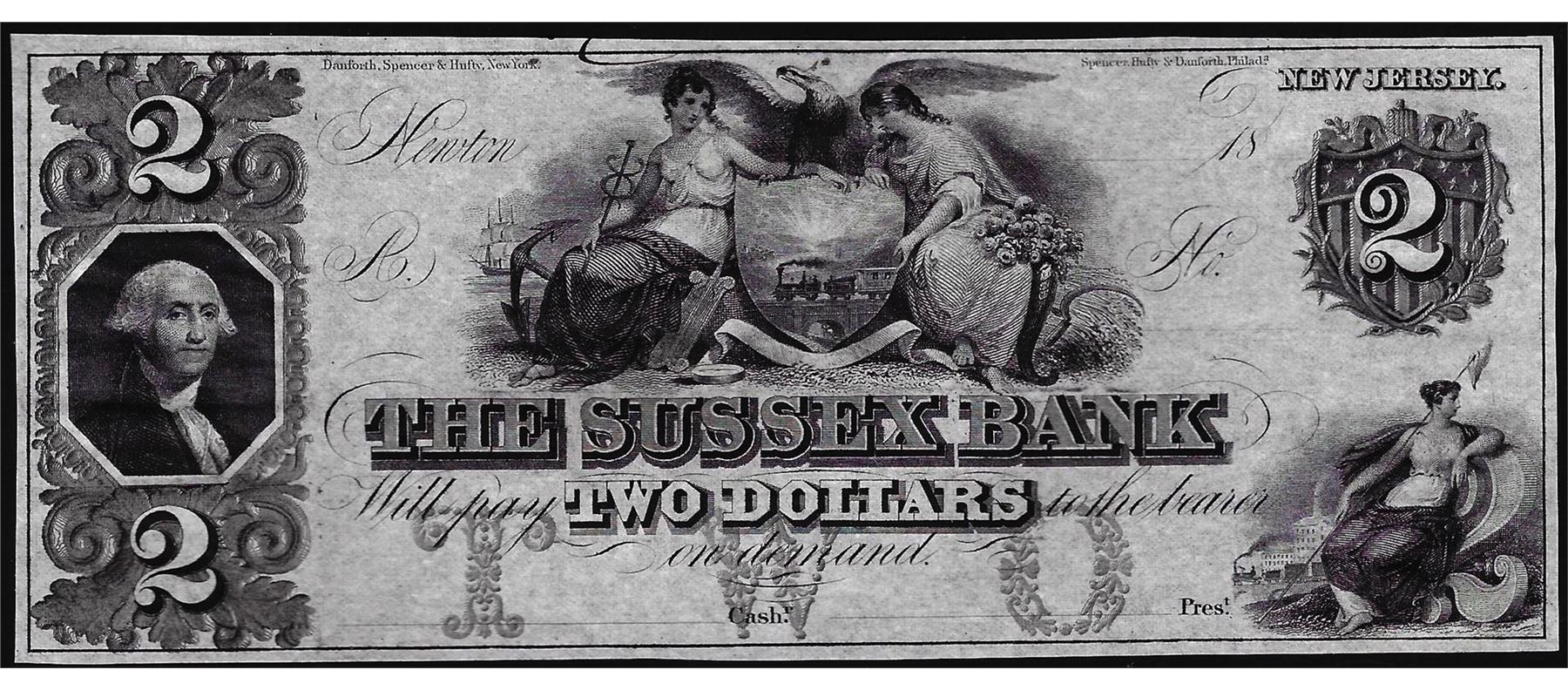 1800's $2 The Sussex Bank Newton, New Jersey Obsolete Currency Note