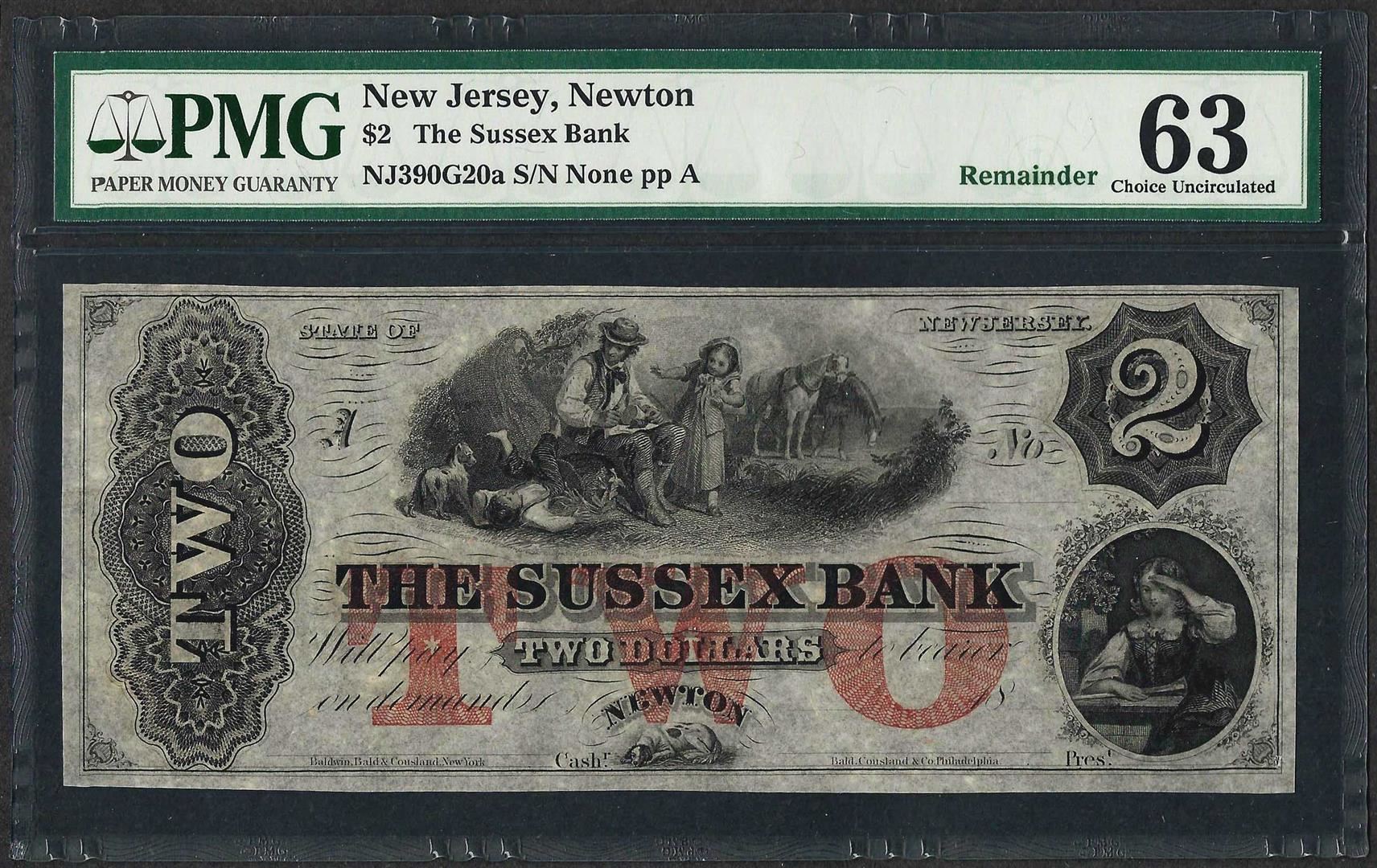 One 1800's $2 The Sussex Bank Obsolete Note PMG Choice Uncirculated 63. PMG Certified.