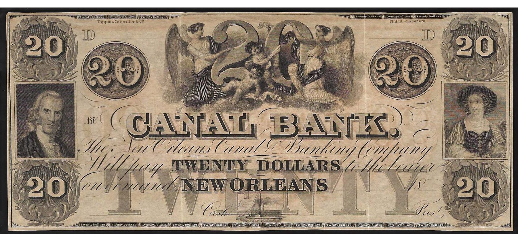 One 1800's $20 Canal Bank New Orleans Obsolete Note.