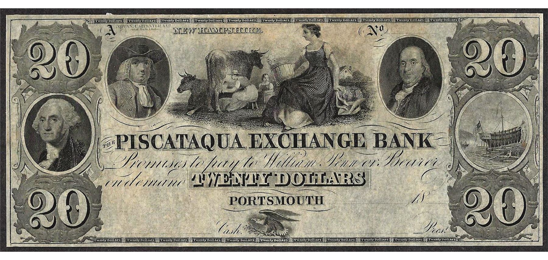 1800's $20 Piscataqua Bank Portsmouth, New Hampshire Obsolete Note