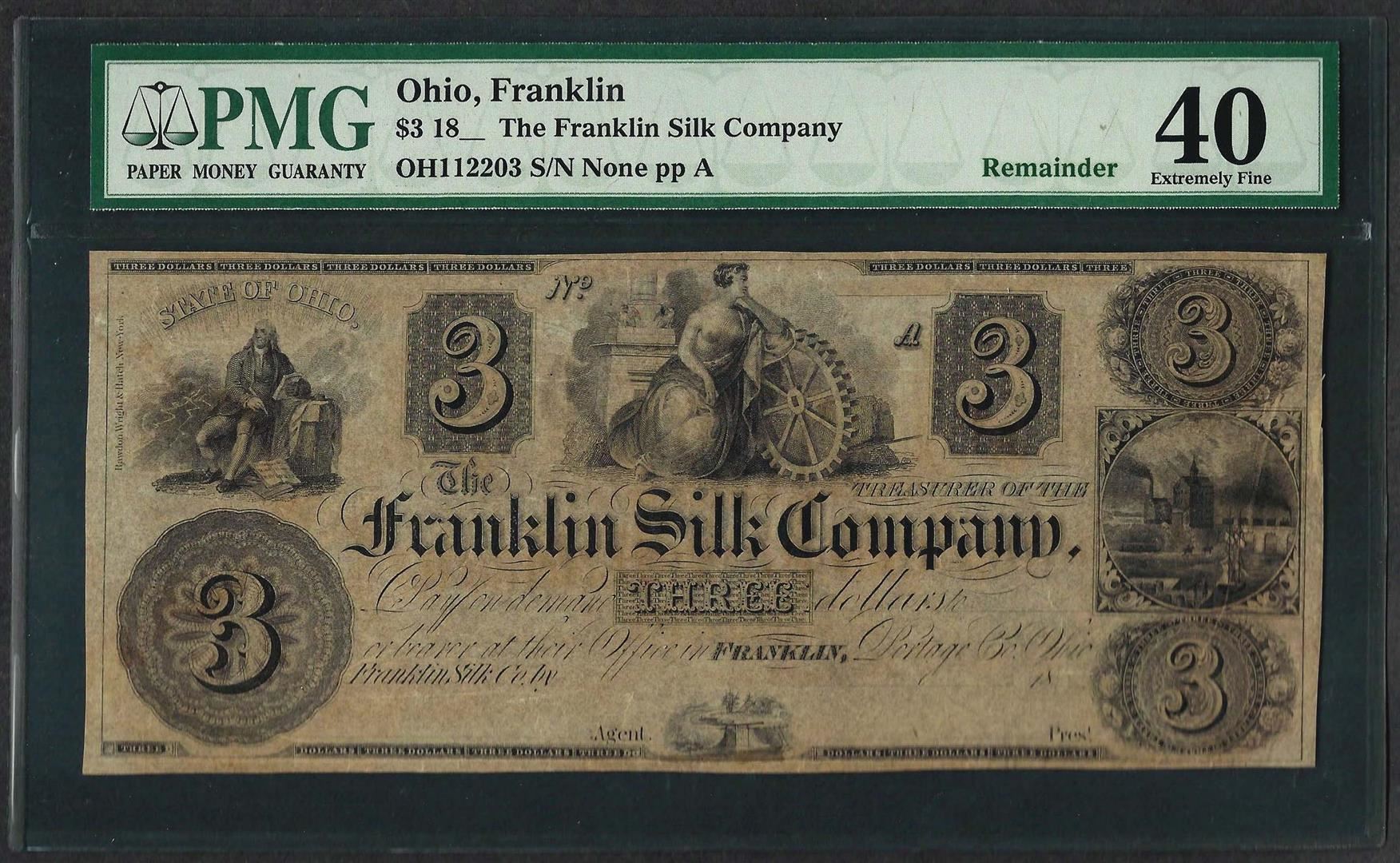 One 1800's $3 The Franklin Silk Company Obsolete Note PMG Extremely Fine 40. PMG Certified.