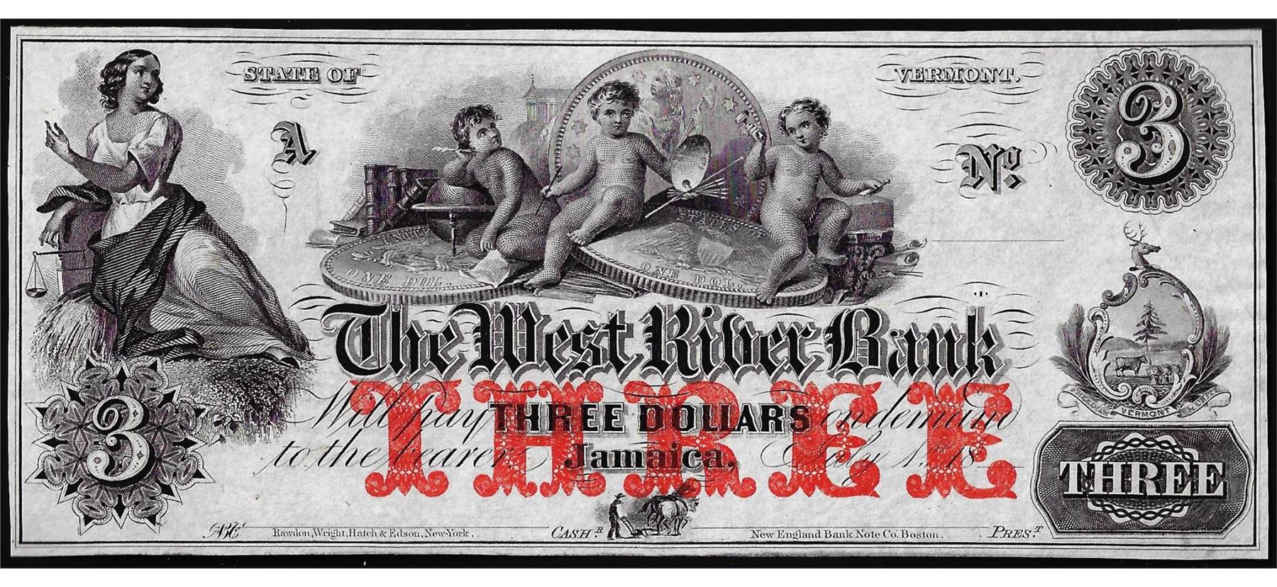 1800's $3 West River Bank Jamaica, Vermont Obsolete Bank Note