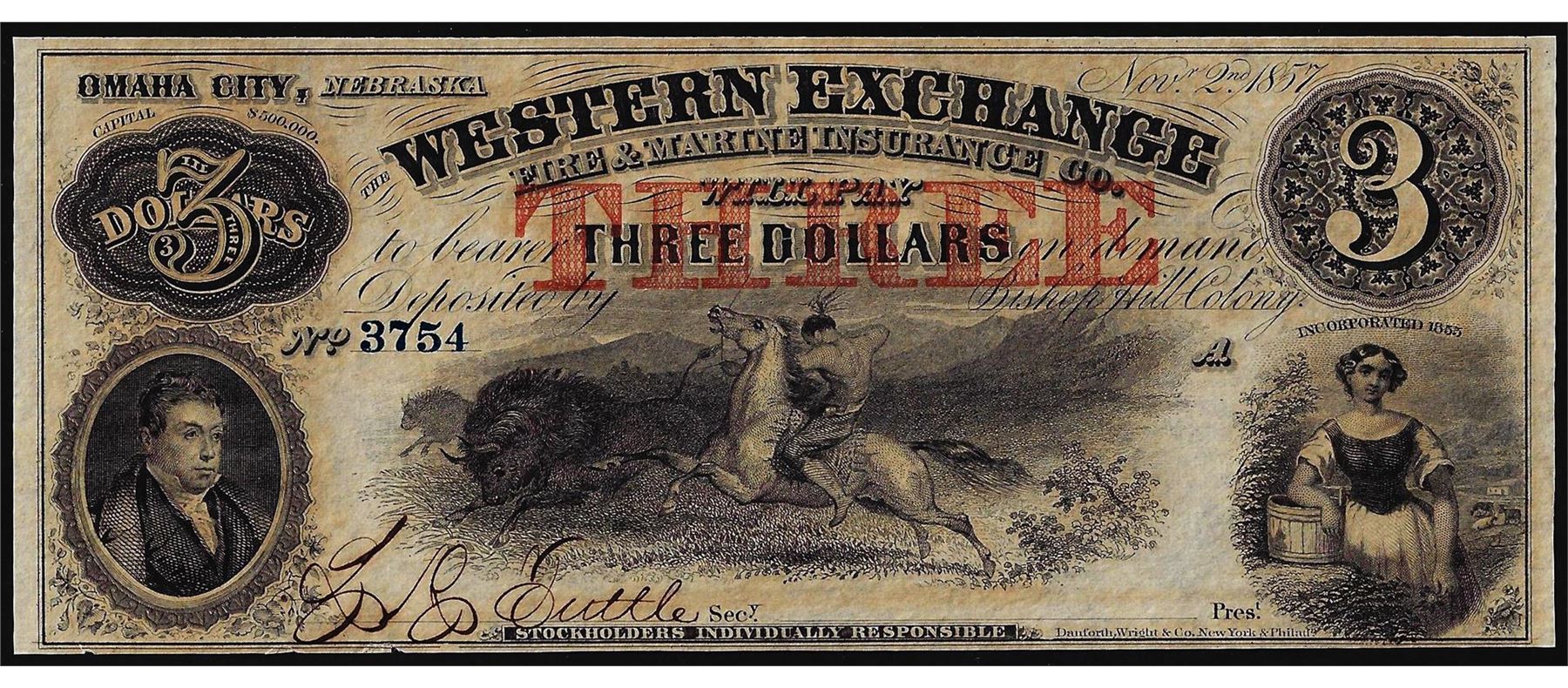 1800's $3 Western Exchange Fire and Marine Insurance Co. Omaha City, NE Obsolete Note