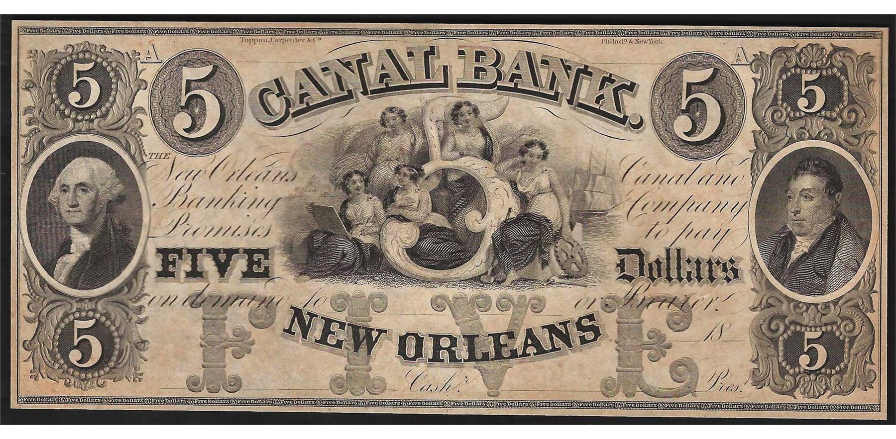 One 1800's $5 Canal Bank New Orleans Obsolete Note.