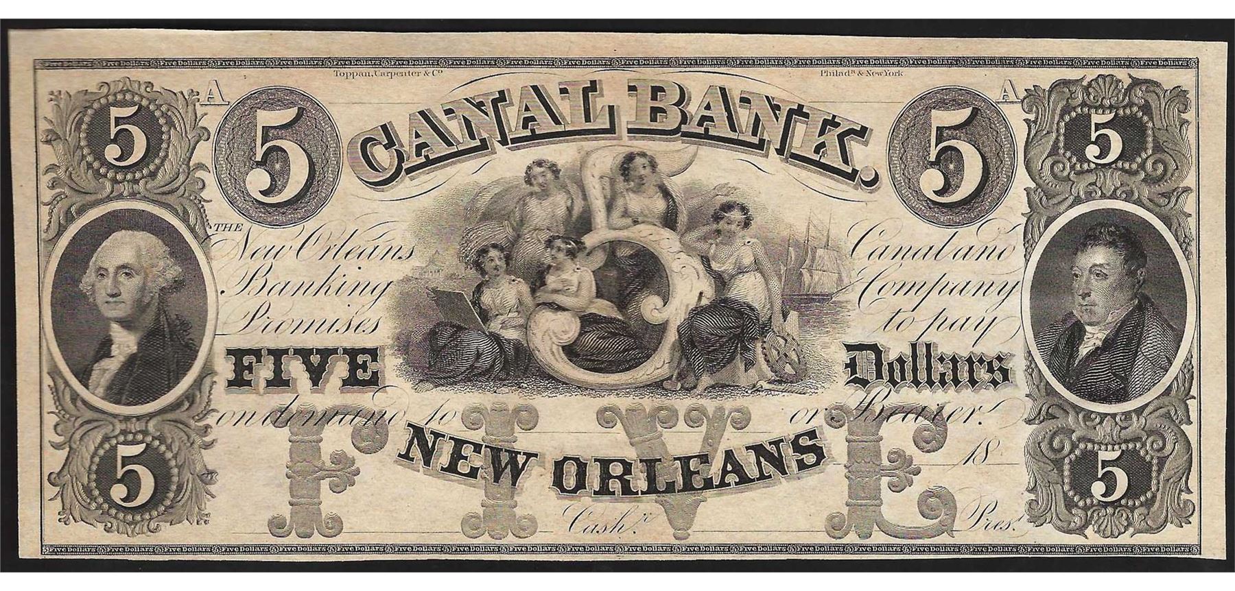 One 1800's $5 Canal Bank New Orleans Obsolete Note.