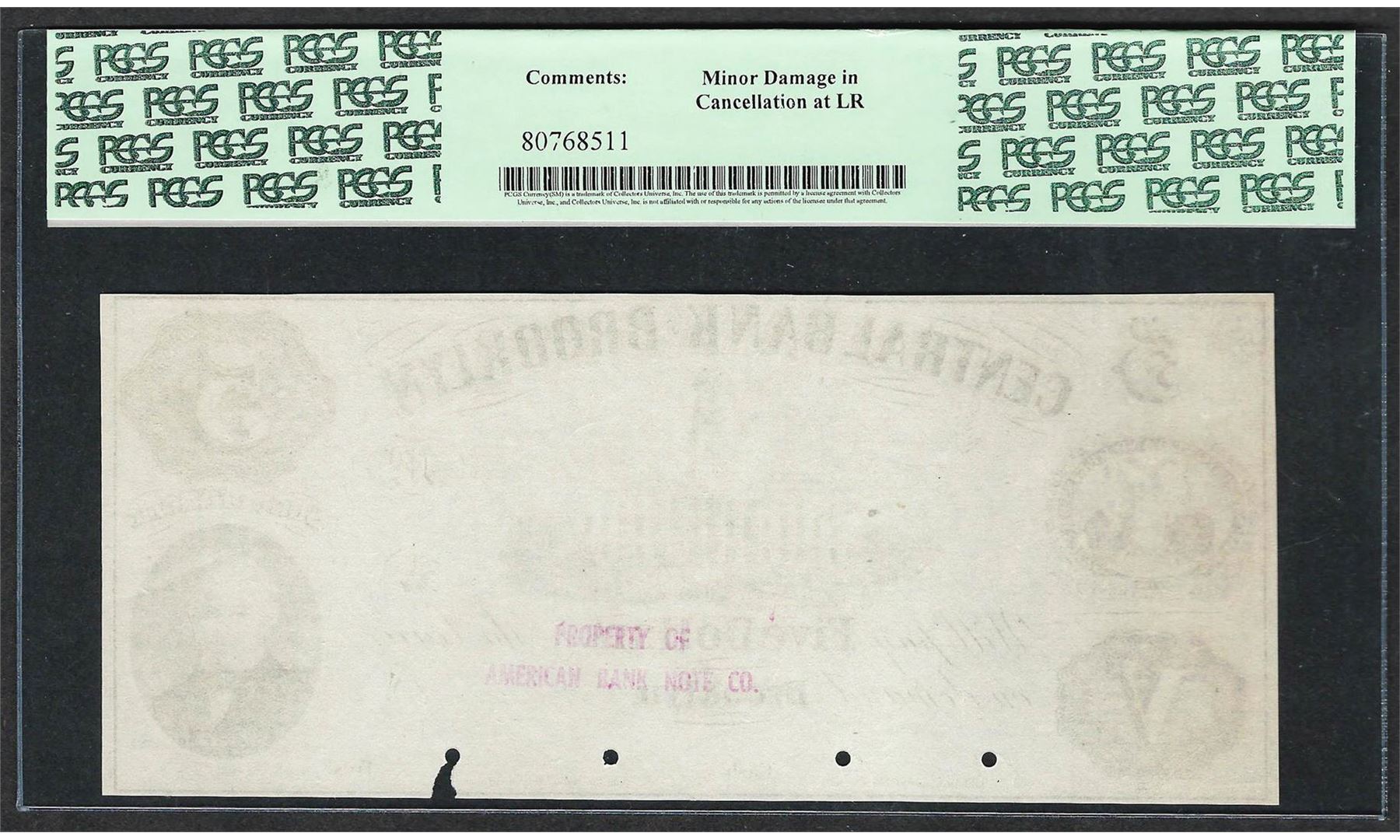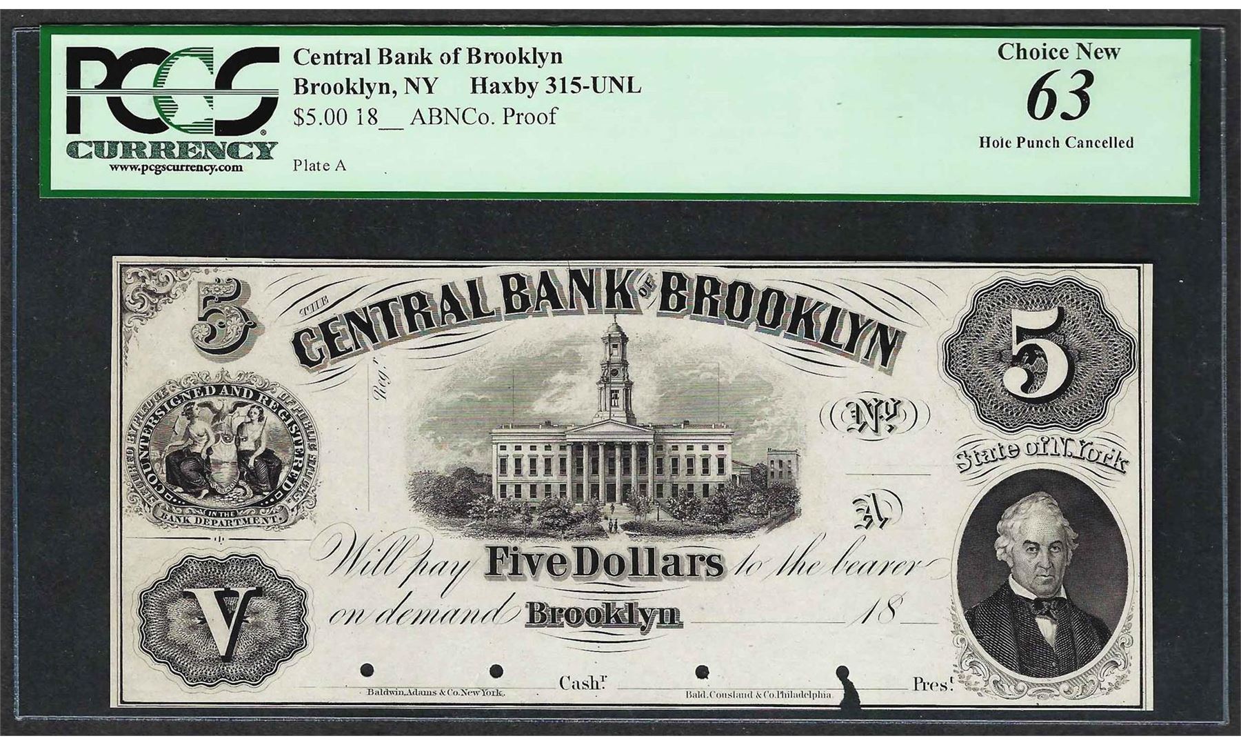 One 1800's $5 Central Bank of Brooklyn Proof Obsolete Note PCGS Choice New 63. PCGS Graded.