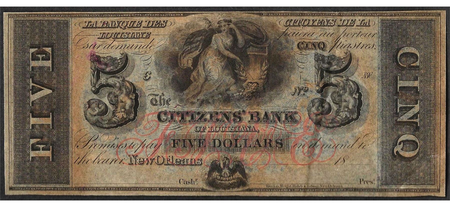 One 1800's $5 Citizens Bank of Louisiana Obsolete Note.