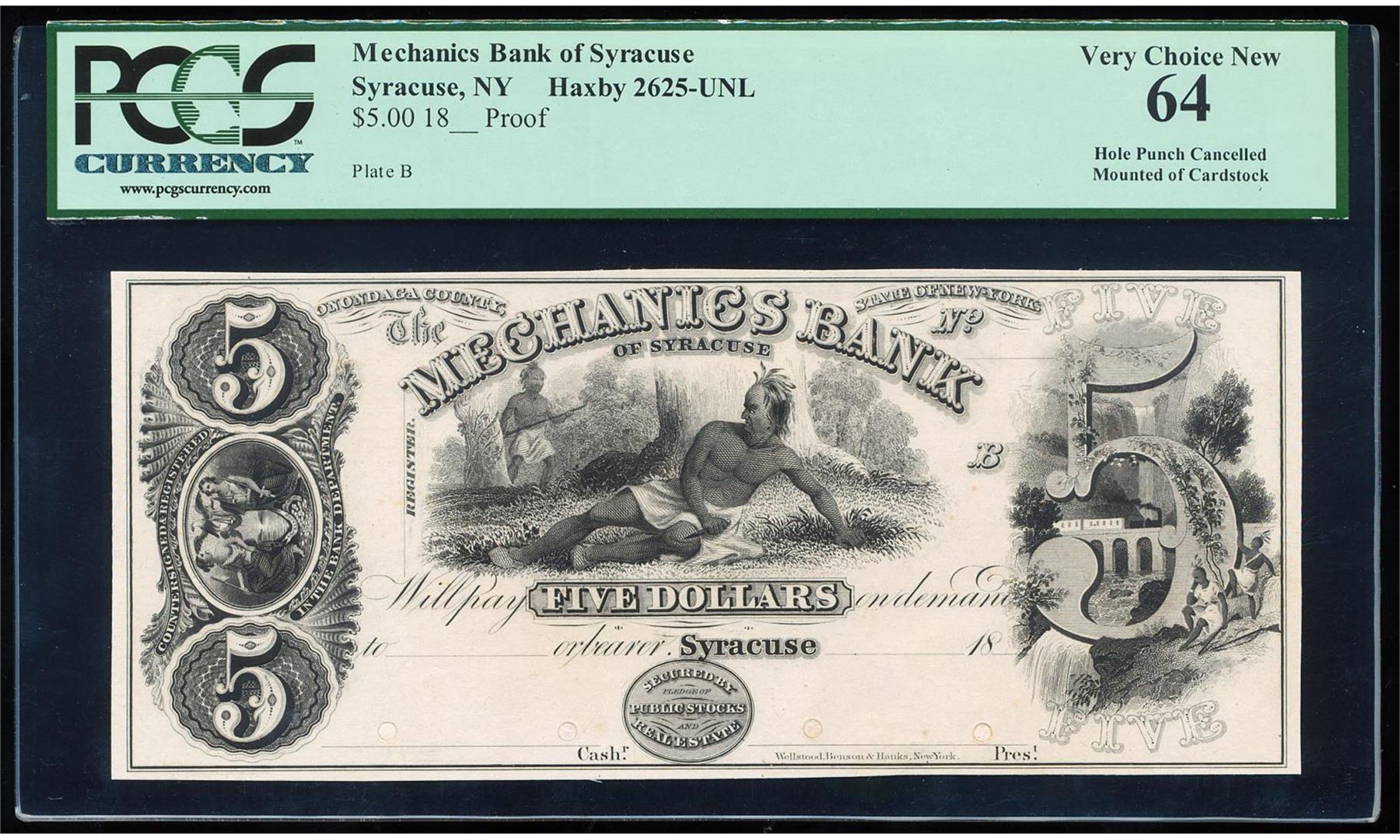 1800's $5 Mechanics Bank of Syracuse, NY Proof Obsolete Note PCGS Very Choice New 64