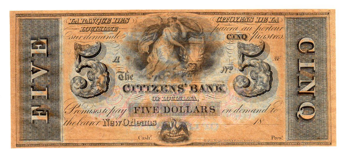 One 1800's $5 New Orleans Louisiana Citizens Bank Note.