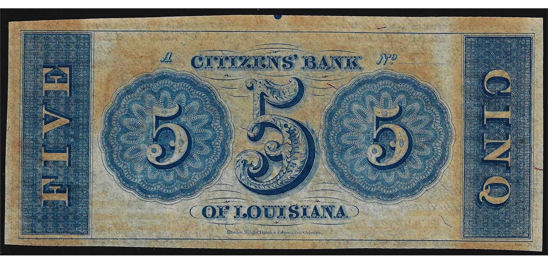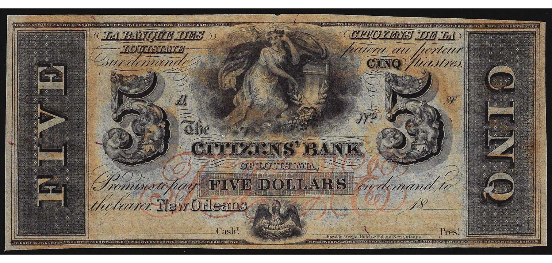One 1800's $5 The Citizens Bank of Louisiana Obsolete Note.