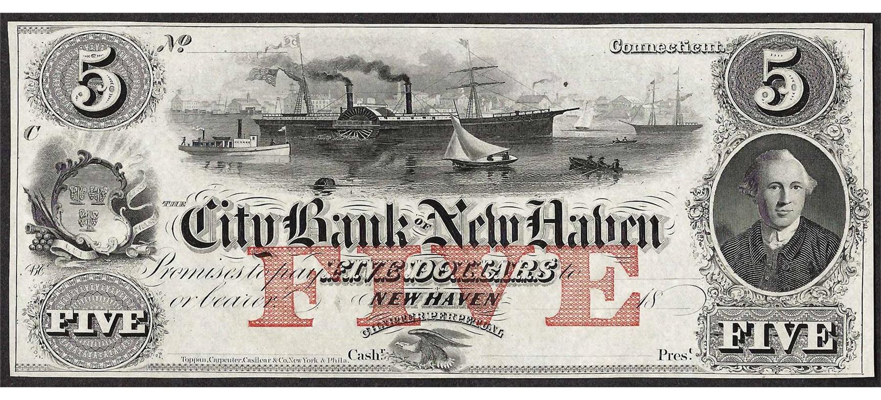 One 1800's $5 The City Bank of New Haven Obsolete Note.