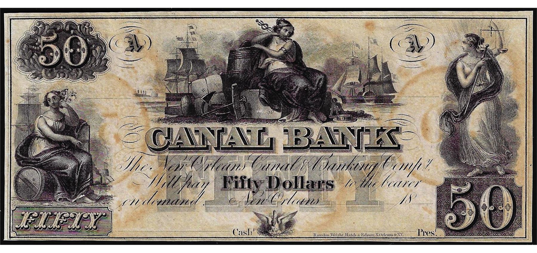 1800's $50 Canal Bank New Orleans, Louisiana Obsolete Currency Note