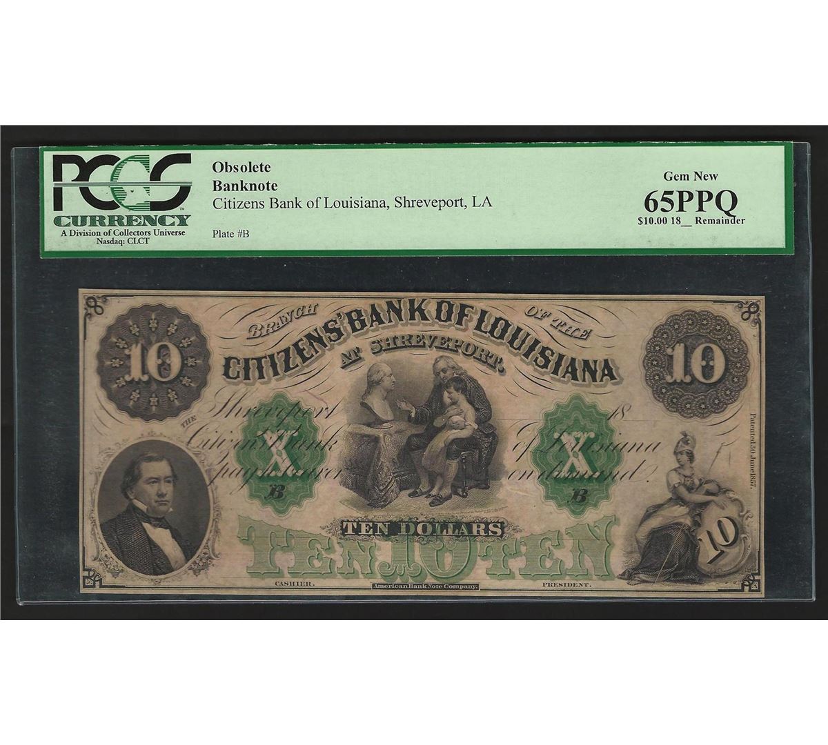 One 1800s $10 Citizens Bank of Louisiana Obsolete Bank Note PCGS Gem New 65PPQ. PCGS Graded.