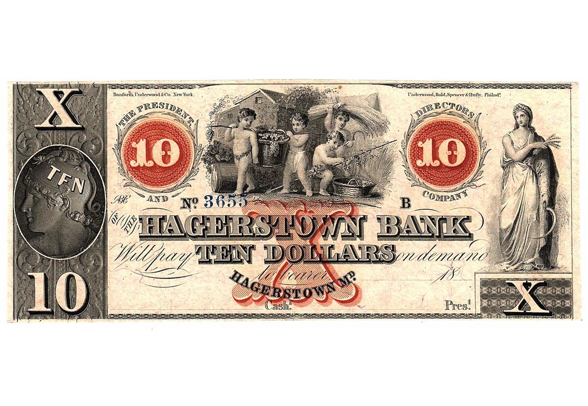 One 1800's $10 Hagerstown Bank Obsolete Currency Note.