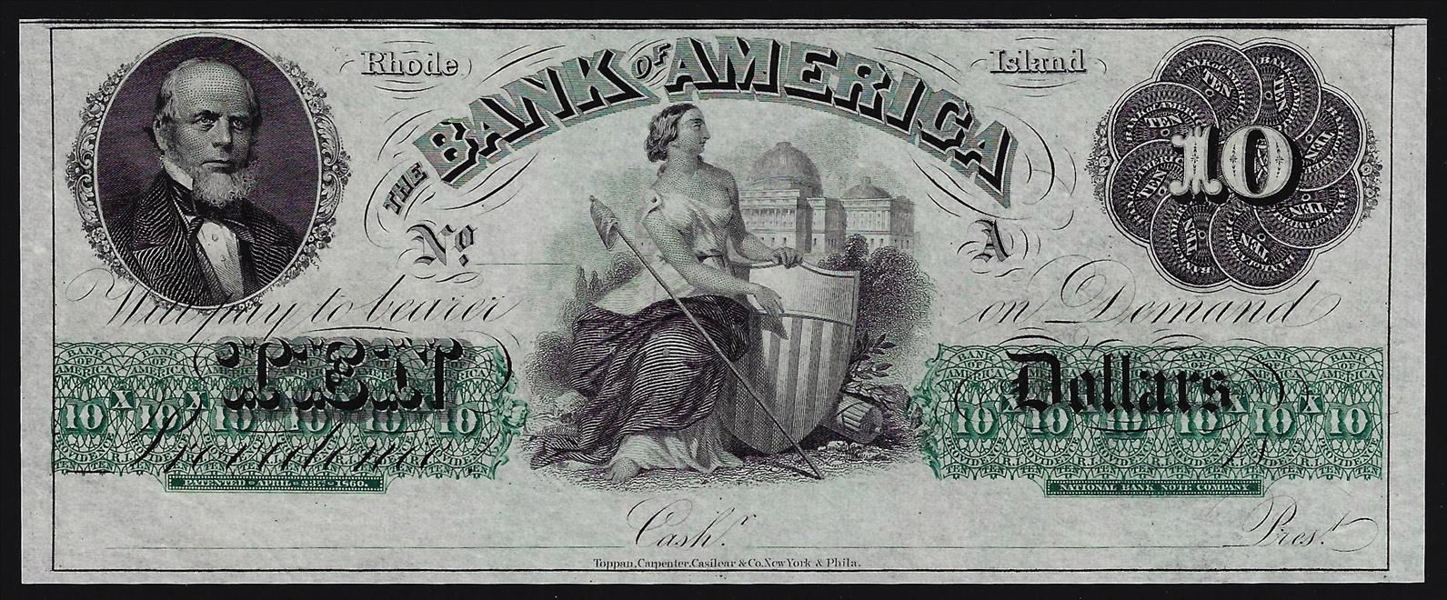 1800s $10 The Bank of America Rhode Island Obsolete Note