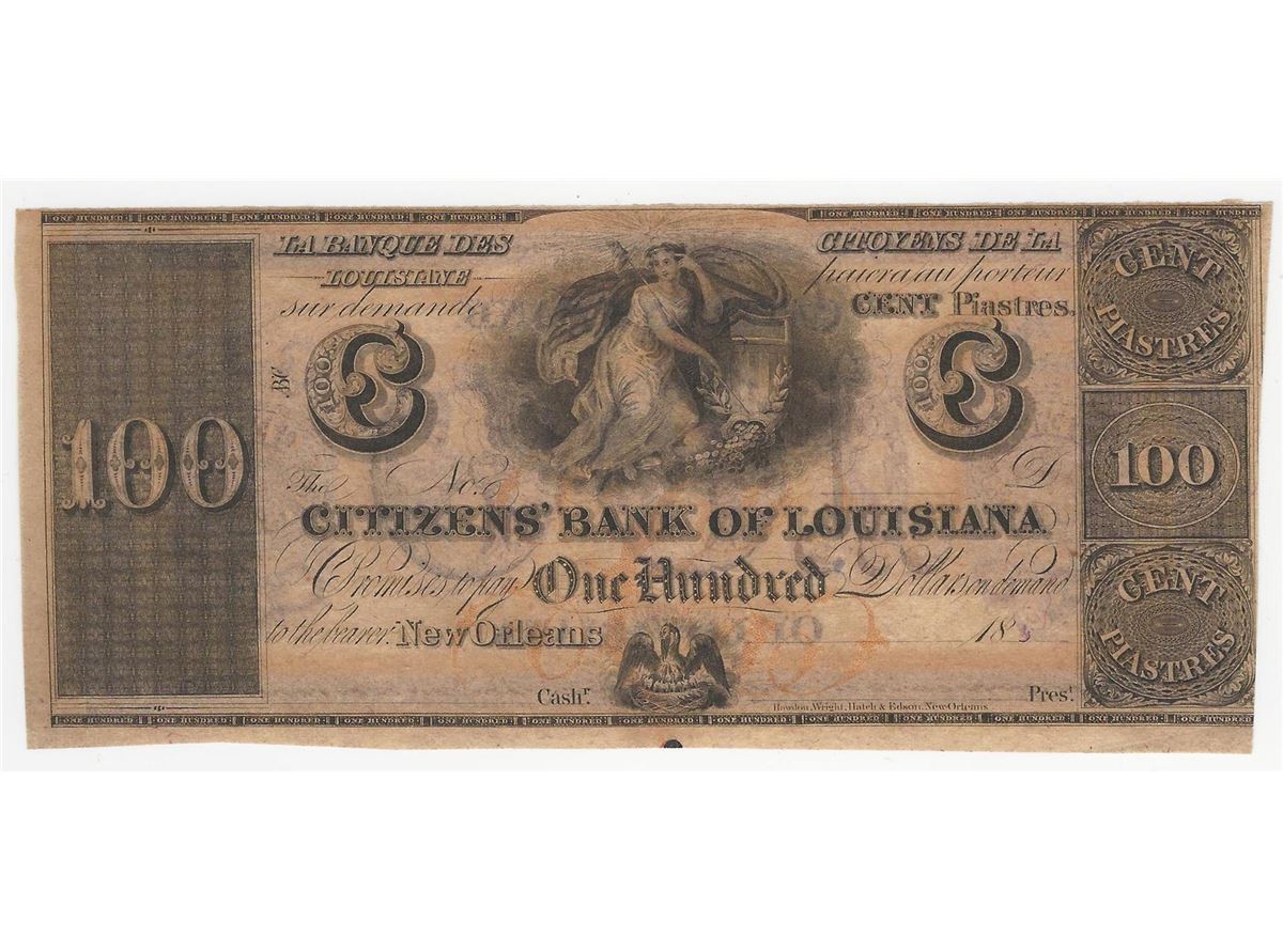 One 1800s $100 The Citizens Bank of Louisiana Obsolete Bank Note.