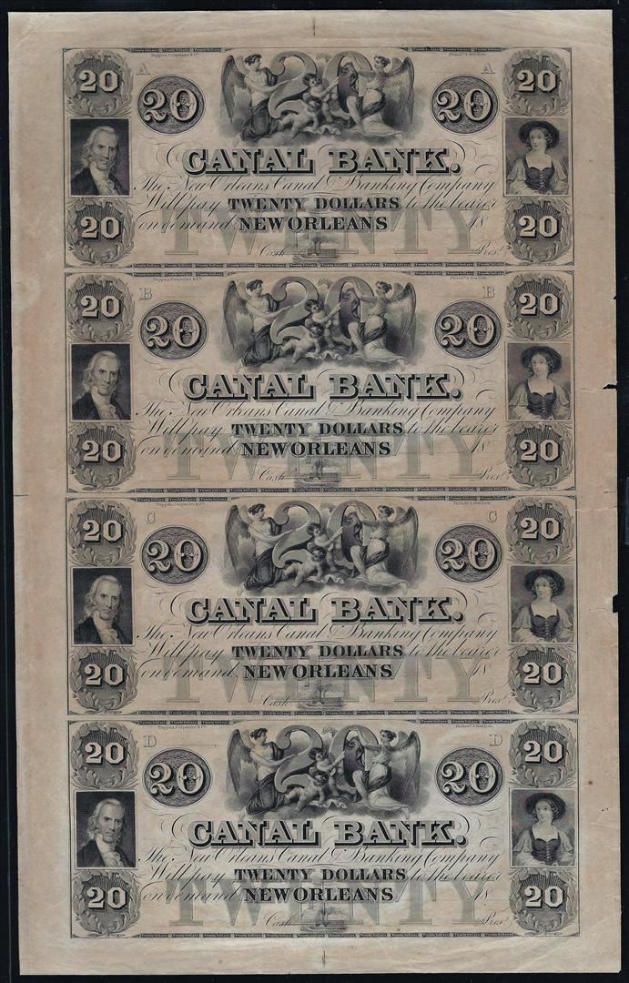 One 1800s $20 Uncut Sheet of New Orleans Canal Bank Obsolete Notes.