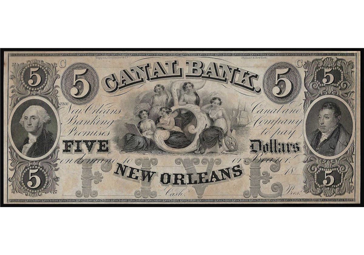 One 1800s $5 Canal Bank of New Orleans Obsolete Bank Note.