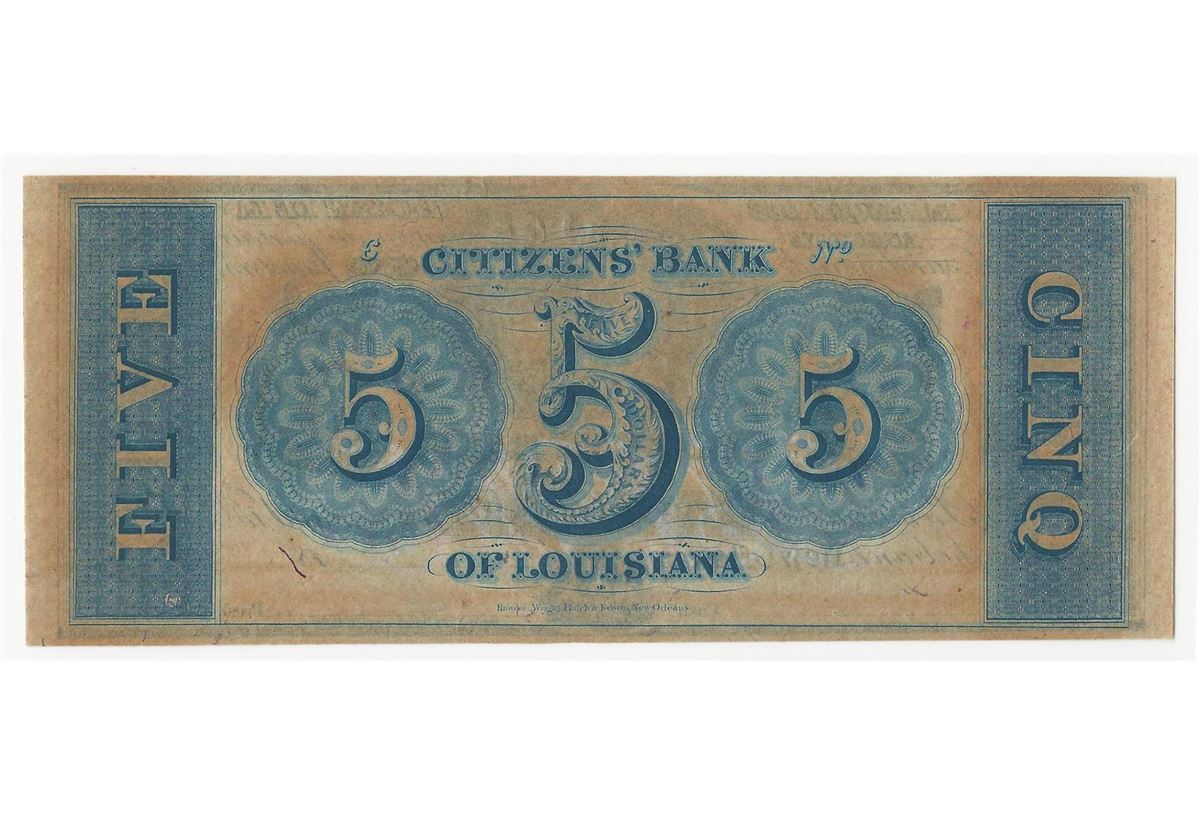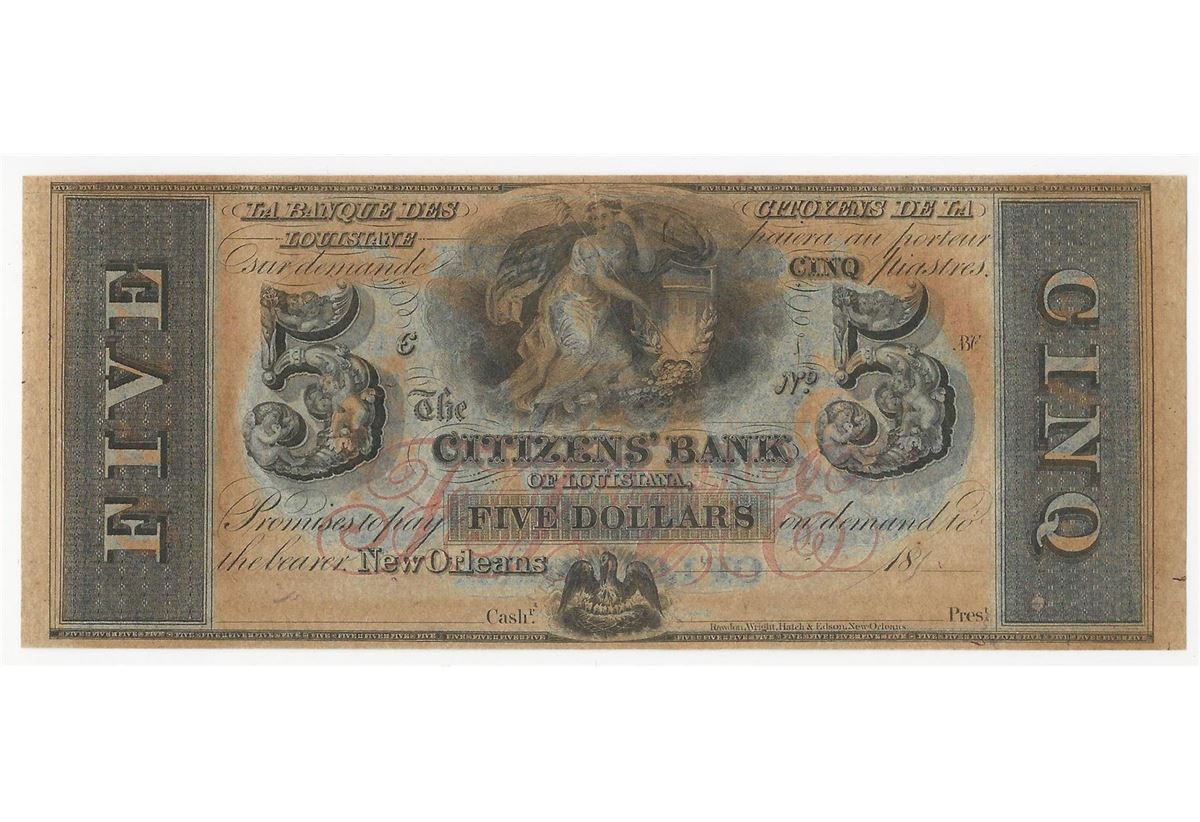 One 1800s $5 The Citizens Bank of Louisiana Obsolete Bank Note.