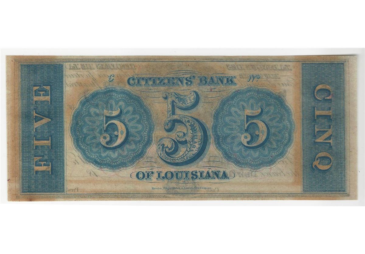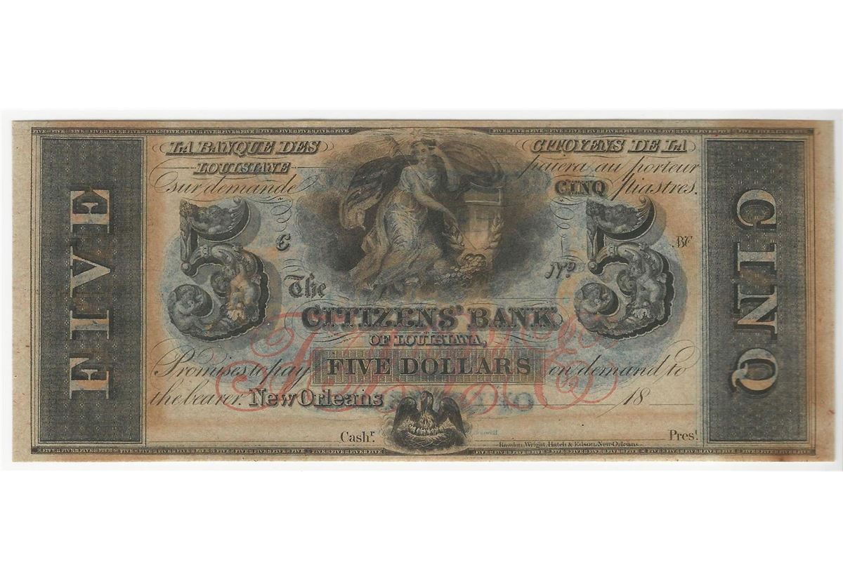 One 1800s $5 The Citizens Bank of Louisiana Obsolete Bank Note.